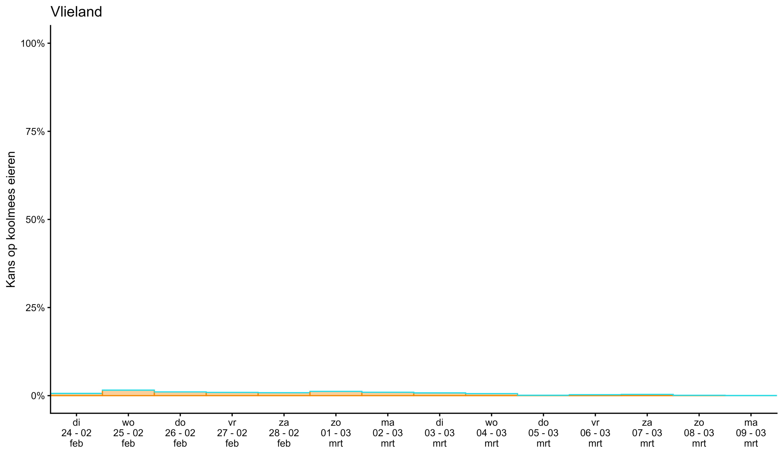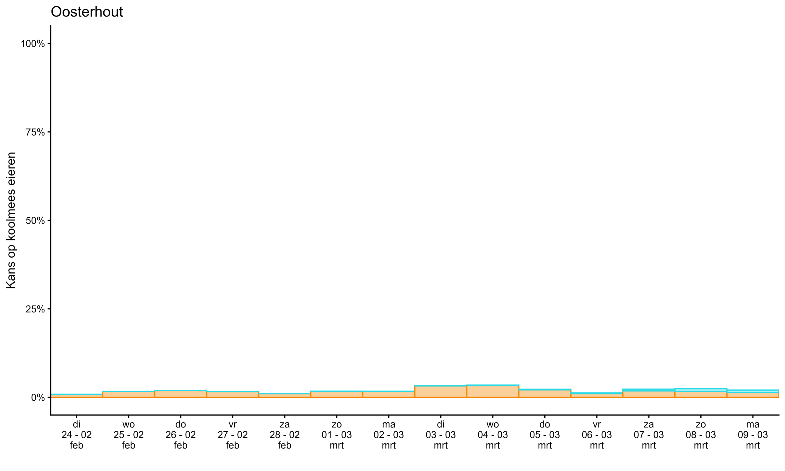 De voorspelling geeft de kans dat in dat gebied minstens een koolmees haar eerste ei van het seizoen legt op die dag. Dat klinkt heel ingewikkeld, maar is eigenlijk vrij simpel.